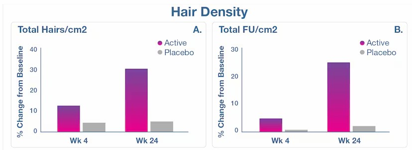 以上结果均具有统计学显著性。相比之下,安慰剂组毛发密度无显著变化。